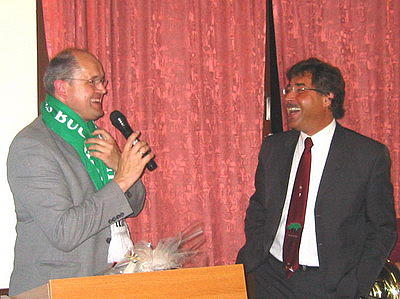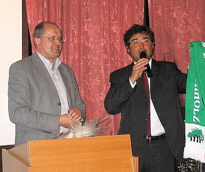Rolf Stoicov, der Präsident, überreicht dem Bürgermeister Erlinger einen Buchholzschal. Da kommt Freude auf...