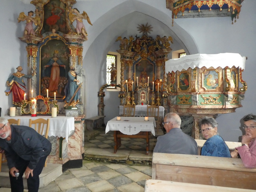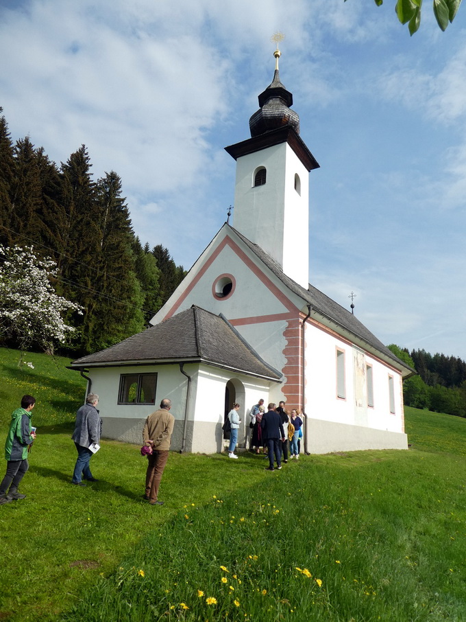 Mit PKW´s ging es um 16:00 Uhr durch das Gegendtal hinauf in den Gemeindeteil Buchholz zur Besichtigung der dortigen Filialkirche, einer bereits im 16. Jahrhundert im gotischen Stil errichteten Kirche. Sie befindet sich in der Streusiedlung Buchholz der Gemeinde Treffen auf freiem Feld in 924 Meter Höhe auf der Westflanke des Gerlitzen-Massivs über dem Gegendtal.