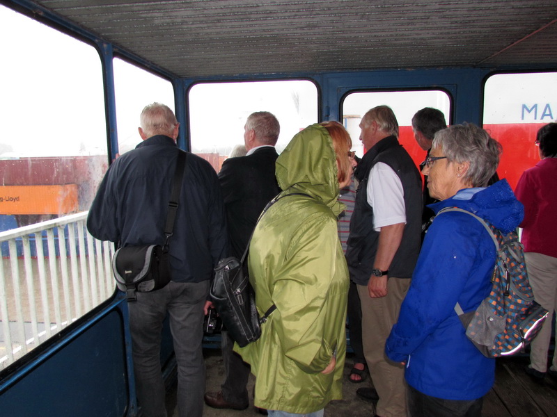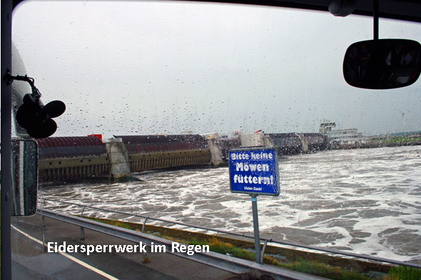 Nun geht es weiter zum Eidersperrwerk. Doch leider ist der Regen wieder so stark, dass wir das Sperrwerk nur vom Bus aus besichtigen können. Deshalb fahren wir direkt durch zum Kaffeetrinken in die „Welt“.