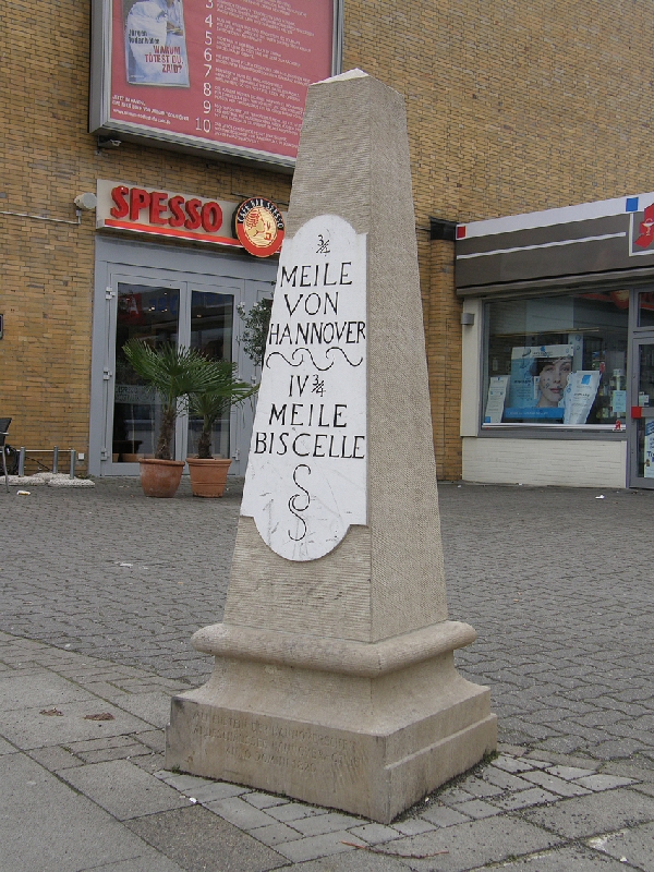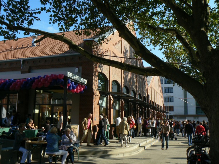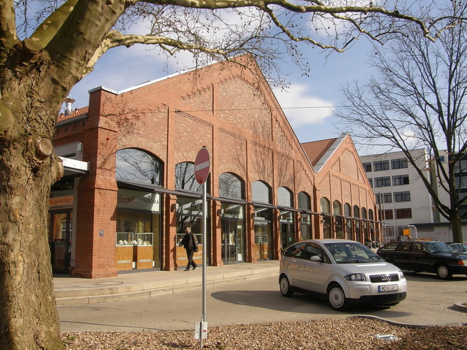 symbolischer Maibaum mit Werbeplaketten der im Einkaufsbereich vertretenen Firmen. Hier finden regelmäßig sog Bauernmärkte statt. 2009 wurde die benachbarte denkmalgeschützte Halle des Straßenbahndepots der Üstra saniert und zu Geschäften ausgebaut.