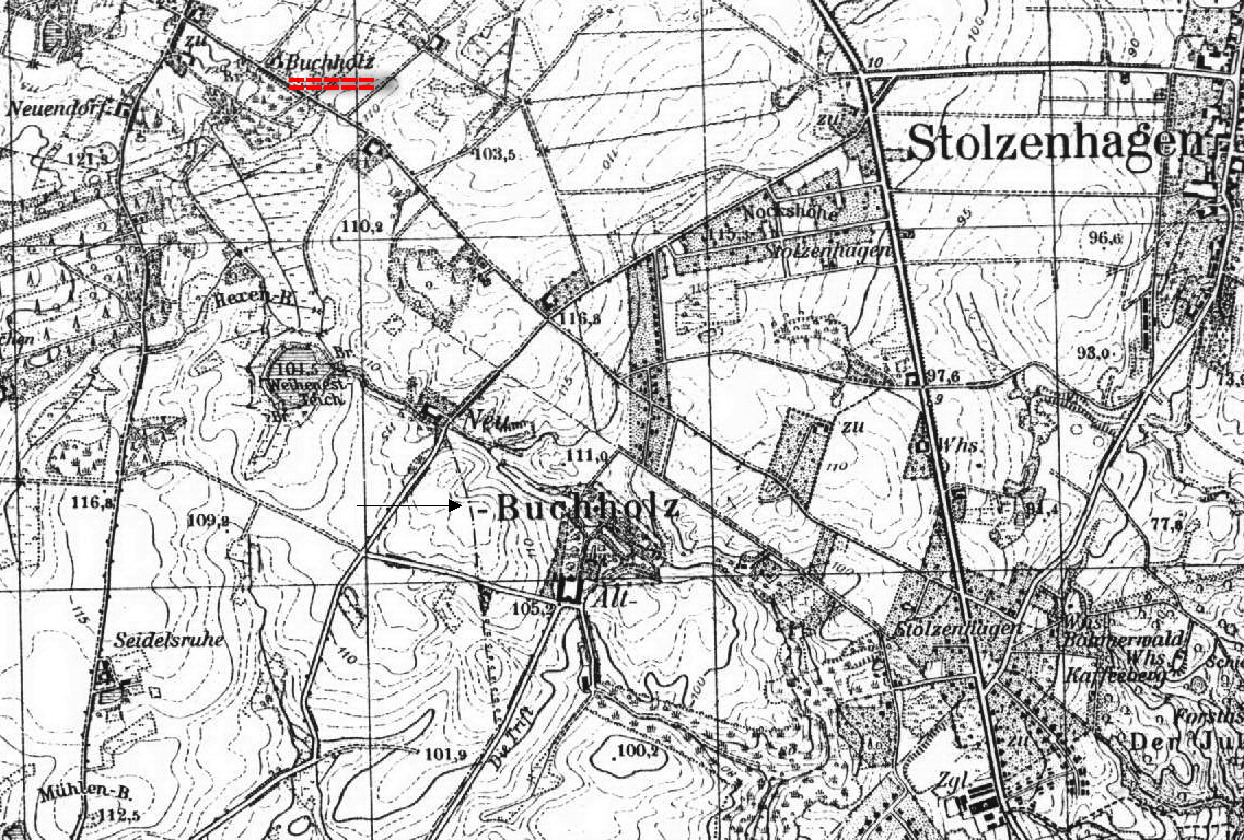 *) Hier liegt vermutlich der ehemalige Ort Buchhholz der ehemaligen Gemeinde Buchholz im Kreis Randow.