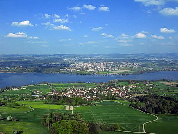 die zirka 800 Hektaren. Grüne Wiesen wechseln sich ab mit Ackerland und Obstplantagen, Gemüseanbauflächen