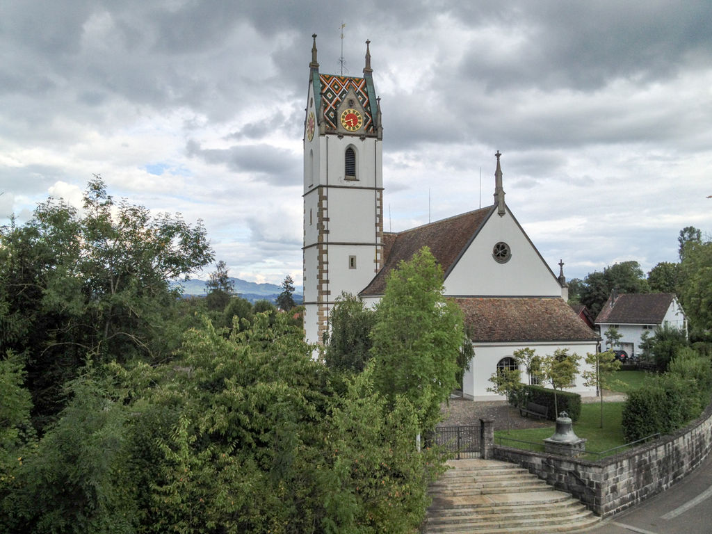 Blick von NNW auf Maur mit seiner Kirche. Im Hintergrund sind die Glarner Alpen zu erkennen.