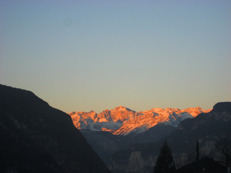 Enrosadira am Morgen: Von Buchholz aus kann man die glühenden Brenta-Dolomiten in den frühen Stunden des Tages betrachten.