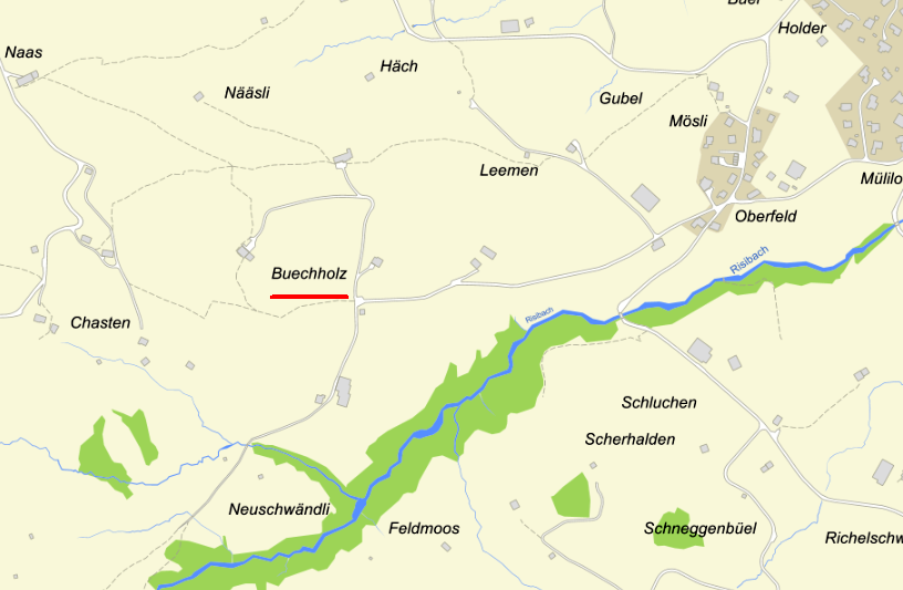 'Buechholz besteht aus einigen Eizelgehöften und Häusern. Es liegt von Neu St. Johann aus Richtung hinter Bühl.